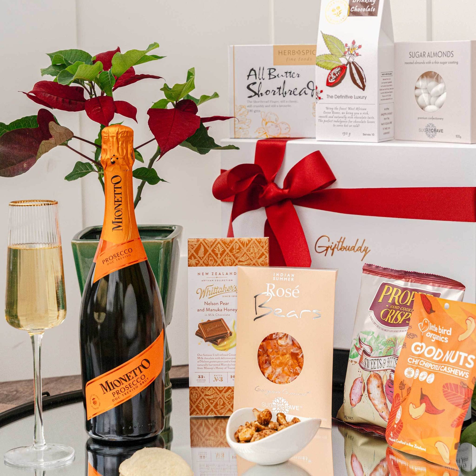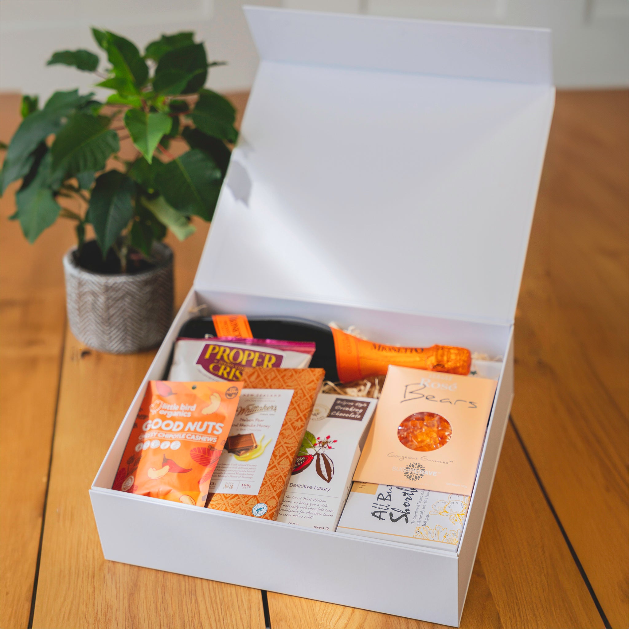 Enhance any event, including weddings, birthdays, and anniversaries, with our carefully curated selection. Impress your loved ones, clients, or friends with our high-quality choices that stimulate the senses and elevate the occasion. Begin the festivities with the renowned Mionetto Prestige Prosecco Rosé, a refreshing and delightful Italian sparkling wine that sets the tone for an unforgettable celebration. Complementing this bubbly treat are the charming and whimsical Herb & Spice Prosecco "Rose" Bears, adding a touch of sweetness to the event. Indulge in the Sugarcave Sugar Almonds, a delicious combination of sweet and crunchy, and the decadent Whittakers Orange and Hazelnut in 33% Cocoa Creamy Milk Chocolate, offering a symphony of flavors that will please any gourmet's palate.