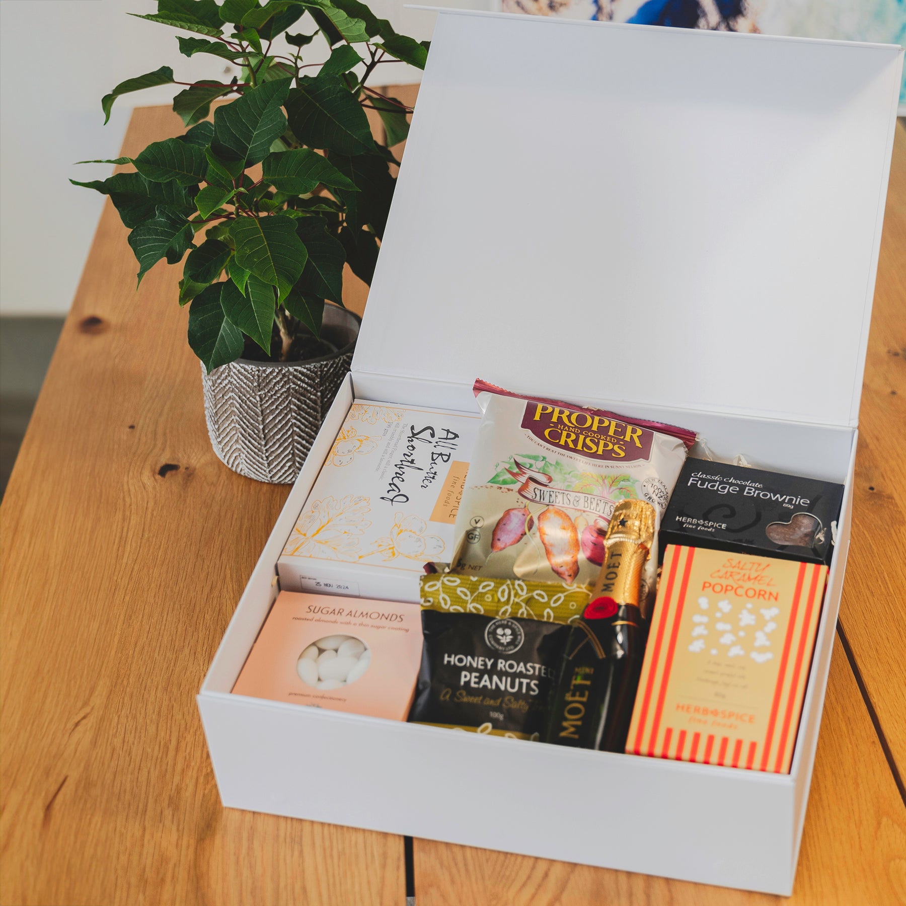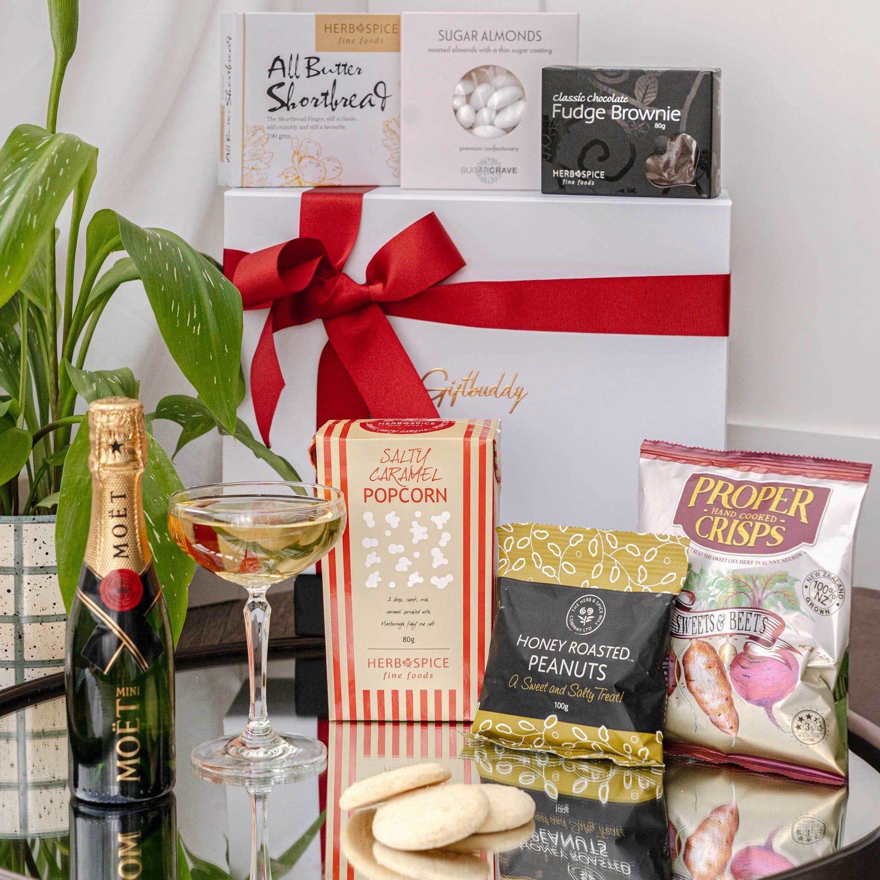 Impress at any event, whether it's a wedding, birthday, anniversary, or a thank-you to clients, with our refined and diverse snacks. Designed to delight and impress, this box is ideal for loved ones, customers, or anyone deserving of a taste of luxury. Inside, discover an exquisite selection of premium delicacies guaranteed to tantalize and create unforgettable memories. Begin the celebration with a touch of opulence with a 200ml MoΓ«t Mini, setting the tone for an exceptional experience. Indulge in the decadence of Herb & Spice Brownie (80gm) and Herb & Spice Butter Shortbread Bites (Red) (50gm), perfectly paired with the irresistible crunch of Herb & Spice Peanuts. Satisfy your cravings with the rich flavors of Sugarcrave Almond Chocolate, a treat for any chocolate lover. Enjoy the satisfying crunch of Proper Crisps Kumara Chips and the irresistible sweetness of Herb & Spice Popcorn.Β